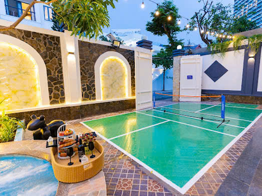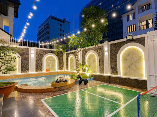 Villa Vũng Tàu Giá Rẻ – A28 là một căn biệt thự 7 phòng ngủ, 11 giường, 8  nhà vệ sinh. Sân Pickleball có sẵn vơt và bóng, sân rộng rãi, thoải mái BBQ bên cạnh hồ bơi. Hồ bơi 60m,có hồ 60cm dành cho em bé.